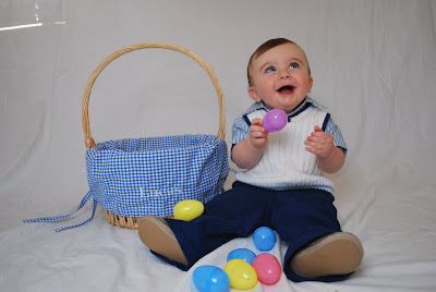 Getting ready for Easter, Lucas plays with his Easter basket and eggs.
